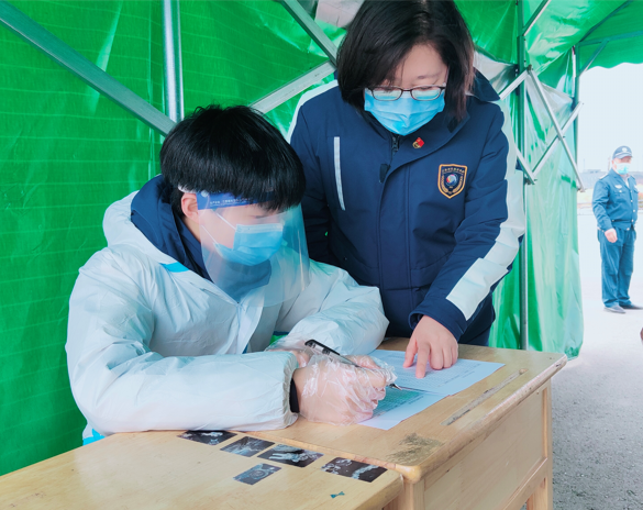 疫情发生时,学校在校师生近2000名,第一次连夜进行大规模的核酸检测全员采集,根本没有什么经验,她一边配合区里布置全员核酸采样点,反复检查医用物资摆放工作是否到位,一边不停地维持秩序,不停地接打电话协调各部门,最终在短短5个小时内,配合医务人员完成了校内2000余人的核酸检测,顺利地完成了第一次的采样任务。为了怕有漏检人员,和后勤人员晚上9点之后将学校6层寝室楼,每一层每一户进行敲门检查,一层层一户户问下来,已经到了深夜12点多。结束后,又步履蹒跚地回到核酸检测点,仔仔细细地清理检测场地,整个疫情期间,她边做边摸索边积累经验,累计有序高效组织师生职工及家属核酸检测10000余人次。