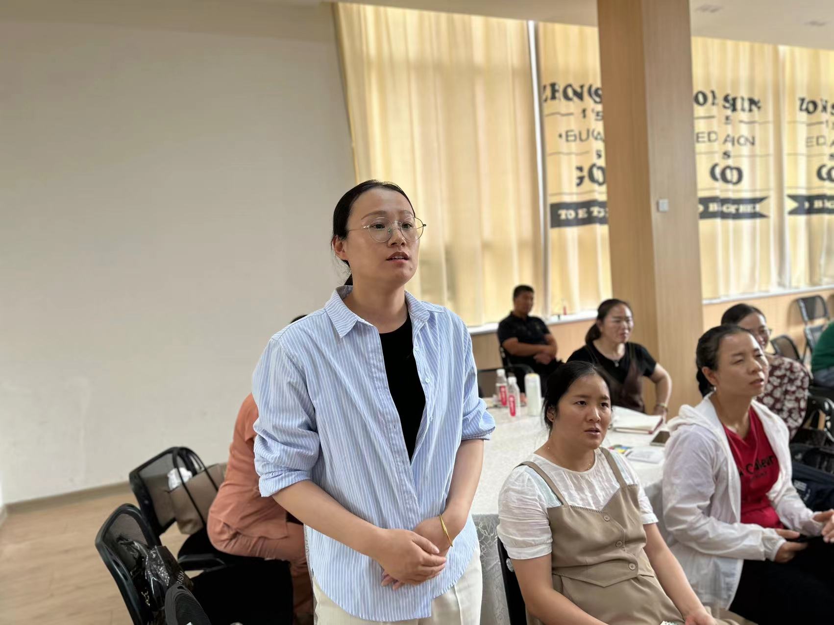 赣榆区青口镇抚育安幼儿园园长仇红代表第三组上台作了组内幼儿园介绍及园所面临的困惑发言。