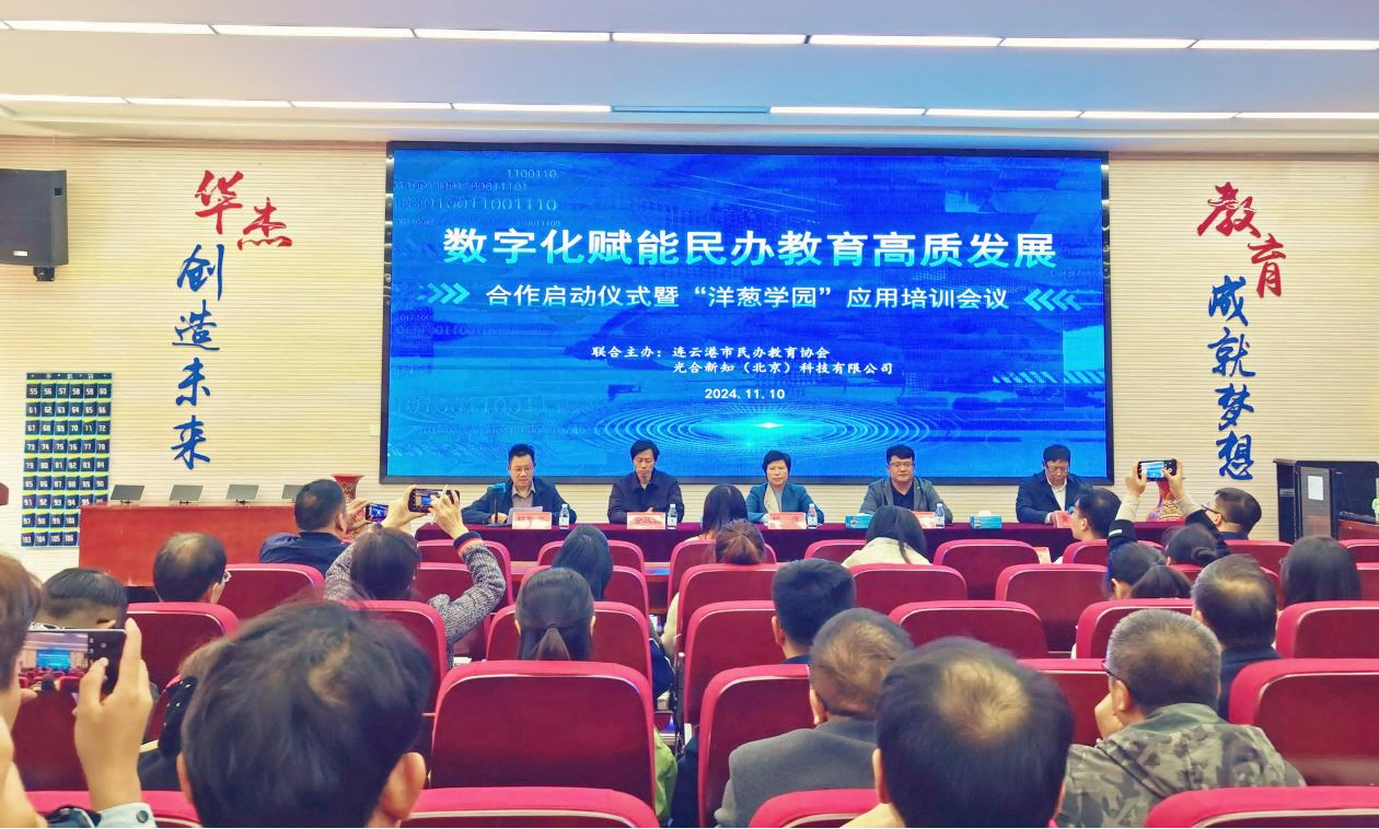 2024 年 11 月 10 日下午,连云港市民办教育协会与洋葱学园合作推进数字化赋能民办教育高质发展的启动仪式和洋葱学园平台应用培训会议在连云港华杰高级中学报告厅隆重举行。此次活动旨在借助先进的数字化教育平台,提升我市民办教育的质量和水平,为学生提供更加优质的教育资源和学习体验。